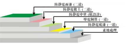 在施工靜電面漆前,先測(cè)試中涂導(dǎo)電層的電阻,要求在10^4Ω以下,這樣面漆層電阻才能控制在10^6Ω-10^9Ω以下,達(dá)到防靜電效果,均勻施工面漆一次。